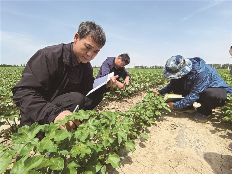 在五运中心村的棉田里,田间巡诊小分队的专家们格外忙碌。自治区农科院植保所研究员许建军翻开棉花叶片背面,看见蚜虫虫卵,神情严肃地向农户说:“蚜虫繁衍速度极快。一旦错过防治关键期,农作物将面临大面积减产。”