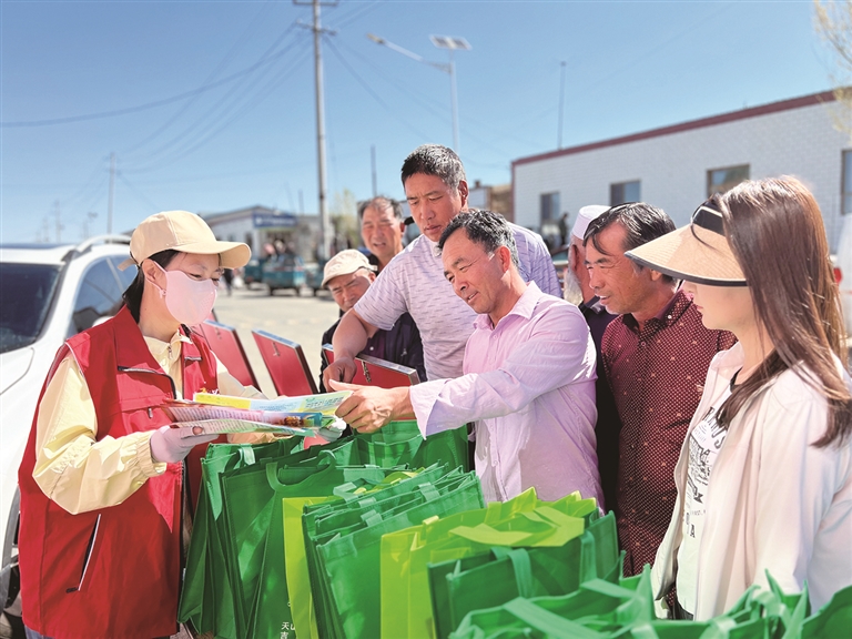 近日,吉木萨尔县林业和草原局在大有镇集市开展“美好生活 民法典相伴”普法宣传活动。工作人员向现场群众解读了《中华人民共和国民法典》中涉及林草工作的物权、合同、侵权责任等条款,并结合当前森林防火、草畜平衡、病虫害防治等工作开展相关宣传。图为工作人员向群众发放宣传册。□胡雅榕摄