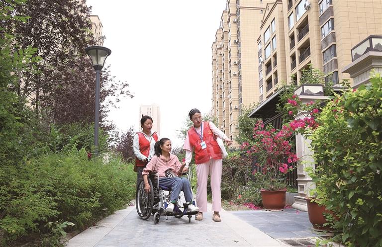 张秀花小时候因意外导致腰部受伤无法行走,出门遛弯成了她每天最期待的事。昌吉市汇同社会工作服务中心工作人员经过前期入户走访和总体评估,为其提供上门助行服务。在王艳和同事的帮助下,张秀花“走出”家门,欣赏着小区的美景,脸上露出了久违的笑容。