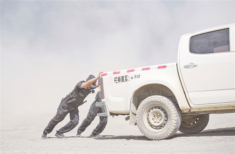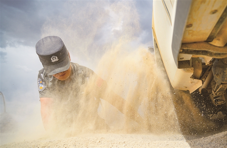 民警使用铁锹等工具,帮助被困车辆清理黄沙。