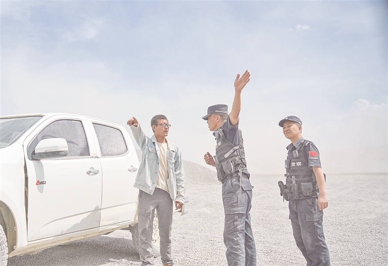 民警顶着风沙为被困驾驶员指路。