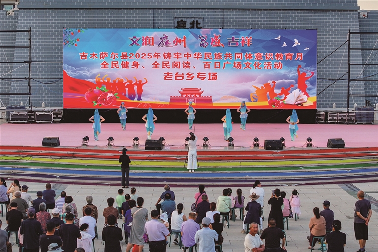6月18日,吉木萨尔县2025年铸牢中华民族共同体意识教育月全民健身、全民阅读、百日广场文化活动老台乡专场在北庭园广场精彩上演,为群众送上了一场丰盛的文化盛宴。□哈力达摄