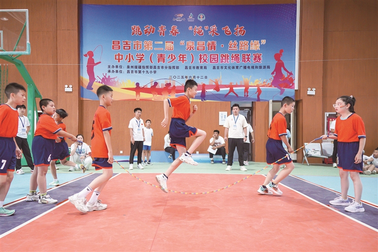 本报讯 通讯员杨斌报道:6月12日—13日,昌吉市“泉昌情 丝路缘”第二届中小学(青少年)校园跳绳联赛在昌吉市第十九小学举行。本次比赛以“跳动青春 ‘绳’采飞扬”为主题,吸引了来自全市16所中小学的330余名学生参赛,参加速度赛和规定赛等项目的比拼,展现全市青少年阳光向上的精神风貌,彰显体教融合的育人成果。