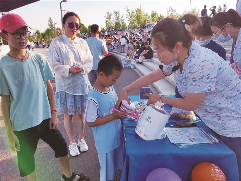 除了精彩的文艺表演外,活动现场还设置了多个特色区域。在文化展示区,书法、簪花、剪纸等作品一一呈现,吸引市民驻足欣赏,感受中华优秀传统文化的独特魅力。趣味游戏区更是热闹非凡,“圈住幸运”“长筷夹娃娃”等游戏吸引了众多市民参与。在咨询服务区,志愿者和工作人员为市民提供了健康体检、口腔检查、免费理发等服务。