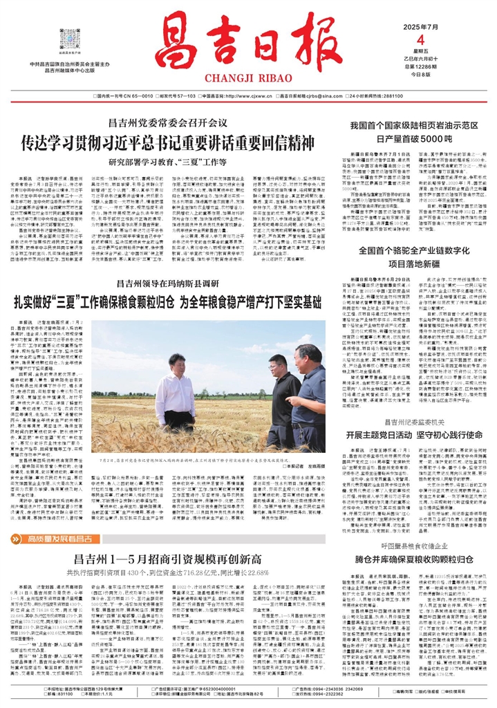 会议强调,要始终牢记习近平总书记“把中国人的饭碗牢牢端在自己手中”的殷殷嘱托,坚决扛起粮食安全政治责任,实行最严格的耕地保护制度,稳步提升粮食综合产能,让“中国饭碗”装上更多优质昌吉粮。要认真做好“三夏”工作,加快小麦抢收进度,切实发挥国有企业作用,落实夏粮收储政策,加大粮食仓储设施建设投入力度,确保夏粮丰收、颗粒归仓。要聚焦重点任务,加快谋划实施一批水利项目,推进高标准农田建设,发挥制种业在推动农业增效益、农村增活力、农民增收入上的重要作用,加强与科研院所合作力度,加快推进现代种业振兴,推进良田良种良法良机良制有机融合,为筑牢粮食安全贡献昌吉力量。