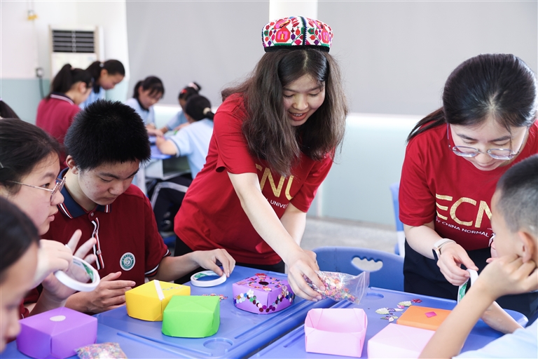7月1日,华东师范大学的大学生志愿者阿依谢(右二)教孩子们制作花帽。□新华社记者 徐 昱摄