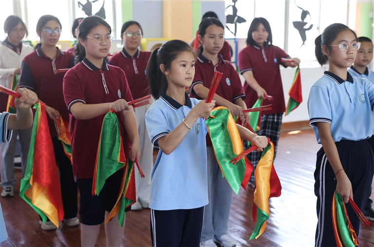 7月1日,东和乡中心学校的孩子们学习筷子舞。新华社记者 徐 昱摄