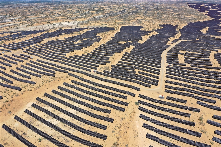 “我们选用高输出功率575瓦特的N型双面双玻单晶硅组件,共安装了104万块,采用逆变升压一体机并网方案,并新建一座220千伏升压汇集站,实现光伏电力稳定收集和输出。”刘宝介绍,目前,这些光伏板产生的绿电,正源源不断地输往乌鲁木齐甘泉堡经济技术开发区。