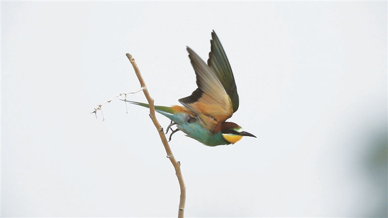 眼下,正值黄喉蜂虎的繁殖期。黄喉蜂虎正忙碌着捕食、筑巢,为繁育做准备。