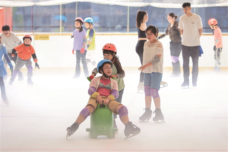 7月13日,小朋友在江苏南京一处室内滑冰场滑冰。