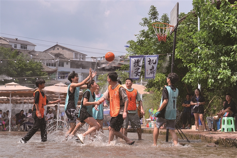7月12日,在重庆市北碚区金刀峡镇偏岩古镇,村民组织参加水上趣味篮球比赛。□新华社发(秦廷富摄)