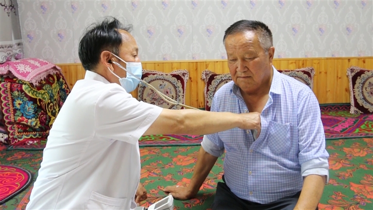 近日,呼图壁县石梯子乡卫生院副院长哈拉哈提·木拉力背着医药箱,来到石梯子乡东沟村牧民苏力提·卡吾叶克家中。“高压136毫米汞柱、低压85毫米汞柱,控制得不错。”哈拉哈提·木拉力一边记录数据,一边叮嘱用药注意事项。对于患有高血压的苏力提·卡吾叶克老人来说,这样的上门服务已成为生活常态。