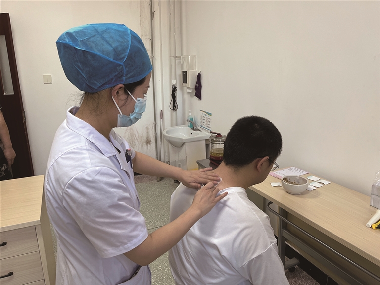 当日是入伏第一天,村民通过艾灸、拔罐、贴三伏贴等中医疗法进行“冬病夏治”,增强身体抵抗力。