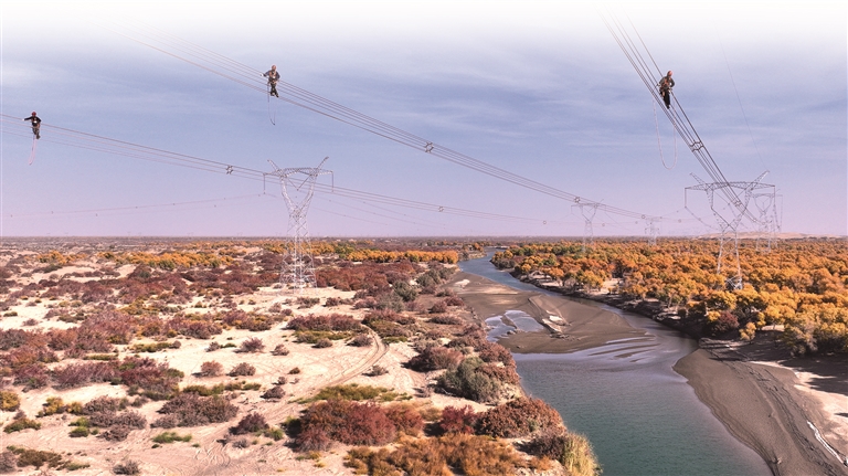 从高空俯瞰,超高压电力环网沿着塔里木盆地,在沙漠边缘、陡峭的山坡上蜿蜒游走,如同舒展的“血管”;近1万座铁塔扎进沙漠戈壁,是撑起整个线路的“骨骼支架”;9座750千伏变电站是跳动的“心脏”,收集风电、光电、火电、水电,调整电压后,再把电送出去。