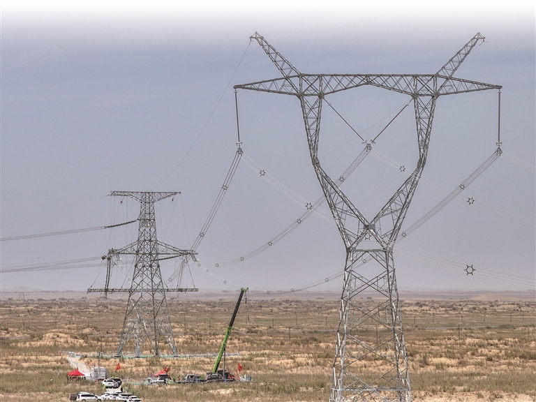 7月13日,在塔克拉玛干沙漠南缘,最后一段电线被轰鸣着的牵引机拽着,从183号铁塔出发,掠过和若铁路和国道315线,最终牢牢锚定在188号铁塔上。