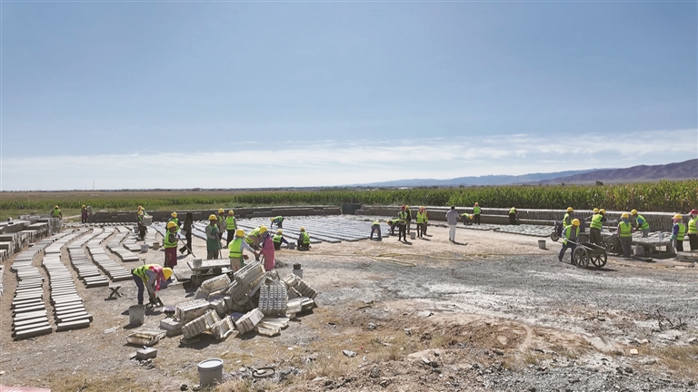 在木垒县新户镇三畦村“以工代赈”项目施工现场,百余名工人各司其职,加固模板、搅拌砂浆、浇筑修整,整个工地忙而不乱,工人干劲十足。新户镇三畦村村民张英说:“我们干一天活能挣150元。”