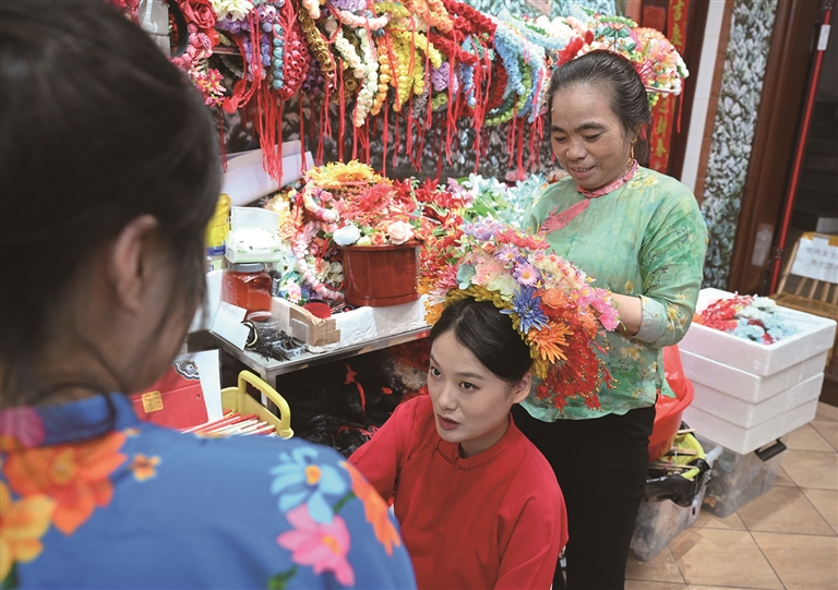 蟳埔村位于福建泉州湾晋江入海口,是古代海上丝绸之路重要起点之一,已有千年历史。蟳埔女簪发戴花的古老民俗被称为“簪花围”。“簪花围”由花围与发簪组成,骨制的发簪和用玉兰、山茶、菊花等鲜花制作的花围,随四季时令与个人喜好,成为蟳埔女生活中不可或缺的元素。2008年,以“簪花围”为代表的蟳埔女习俗被列入第二批国家级非遗名录。
