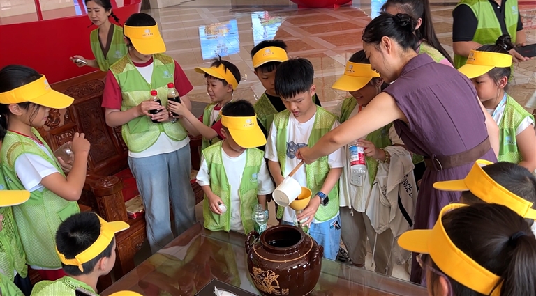 活动首站,大家走进新疆笑厨食品有限公司,探寻日常调味品的奥秘。在专业讲解员带领下,深入现代化生产车间,近距离观摩酱油、食醋等产品的生产流程,了解美食背后蕴含的科技智慧与工艺传承。亲手体验环节点燃了孩子们的热情。醋坊内酸香弥漫,孩子们围拢在古朴的陶缸旁,眼中充满好奇。来自福建的小学生赖冠鑫初次握起木质醋勺,小心翼翼地沿缸壁探下。当浅褐色的醋液缓缓流入玻璃瓶,激起细密泡沫时,他兴奋地说:“原来超市里的醋要经历这么多工序!自己打的醋拌蔬菜,味道特别香!对接下来的行程更期待了。”