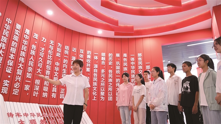 走进昌吉市第七中学的铸牢中华民族共同体意识主题教育展厅,“共拓的广袤疆域、共同缔造的统一多民族国家、共书的历史长卷、共享的文化荣耀、共育的民族精神”五大板块内容展示着各族学生亲如一家、团结奋进的学习生活写照,这也是学校实施“六志六基”(躬耕教育之志,筑牢信仰之基;砥砺爱国之志,筑牢思想之基;通达互通之志,筑牢语言之基;携手团结之志,筑牢情感之基;求索博学之志,筑牢文化之基;笃行强国之志,筑牢行为之基)教育品牌成果的生动展现。“在教室学习的过程中,我们各族同学坐在一起、围成一圈共同商讨,拿出自己的解题办法。在宿舍里我们总是会互相帮助、共同进步。”学生马文博这样说。