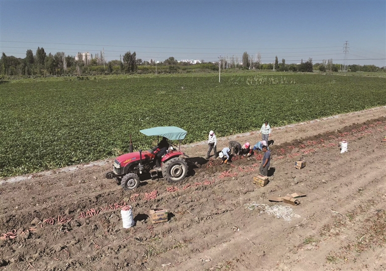 随着红薯收割机在田地里来回穿梭,一个个色泽红润、体态饱满的红薯破土而出,均匀地铺排在田垄上。村民们紧随其后,有序地清理着红薯表面的沙土,并按照大小分拣,装箱入车。种植户张有忠高兴地说:“我们的红薯个头大、品相好、甜度高。我今年种了30多亩‘西瓜红’,主要销往奇台县、木垒县、吉木萨尔县、阿勒泰市及周边市场,还有很多商家直接到地头收购,预计9月底就能全部收完。”