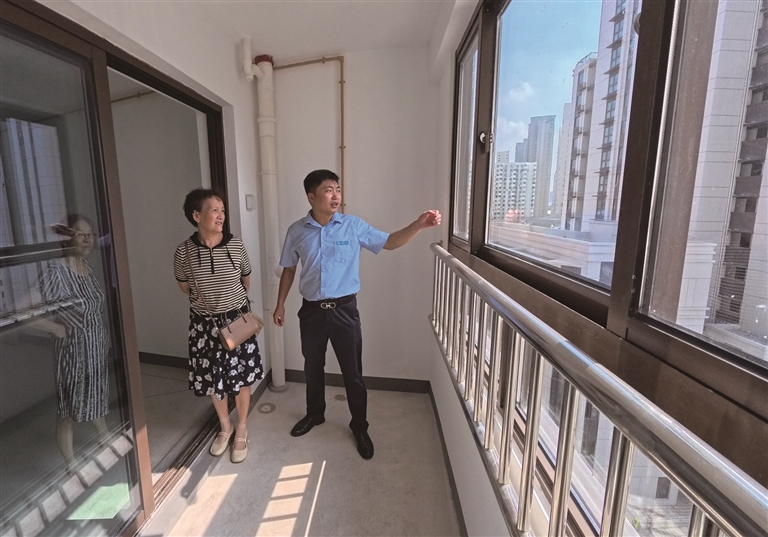9月15日,中建二局工作人员在新房内向居民介绍房屋结构。