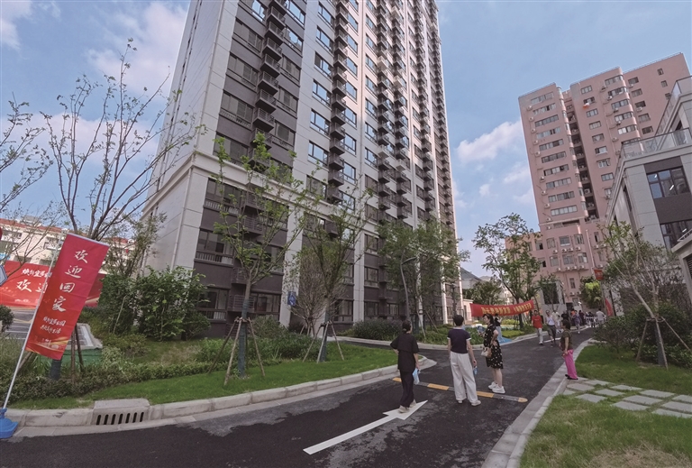 9月15日,谈家桥小区的老邻居们走在新家小区内。