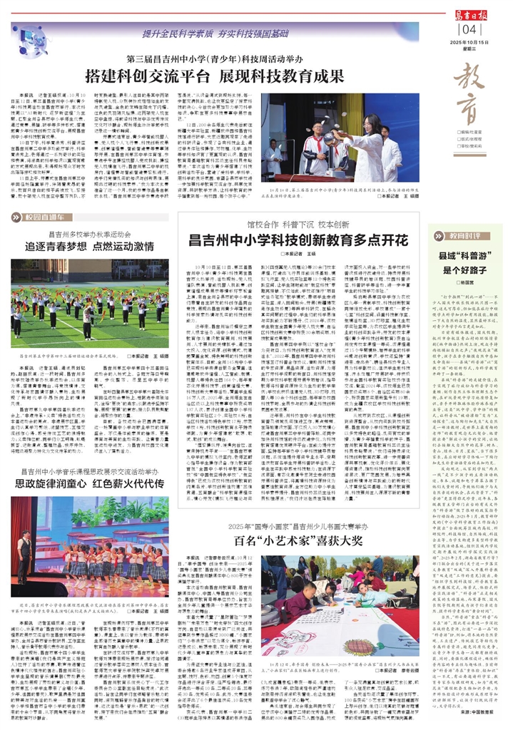 从城市到农牧区,从课程创新到资源整合,从校内实践到校外拓展,昌吉州中小学科技创新教育正以多元特色的路径、扎实有效的举措,为青少年播撒科学的种子。昌吉州教育局基础教育科三级主任科员朱晓琴说:“我们将持续深化科技创新教育改革,进一步完善资源共享机制、优化评价体系、强化师资建设,推动科技创新教育向更深层次、更广范围发展,为培养具备创新精神与实践能力的新时代人才奠定坚实基础,为建设教育强州、科技强州注入源源不断的青春力量。”