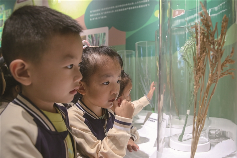 左图:10月14日,在青岛市李沧区实验幼儿园,小朋友在辨识粮食。