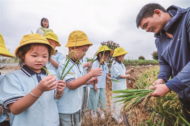 下图:10月14日,在浙江省湖州市吴兴区东林镇保永村的稻田里,东林镇中心幼儿园的孩子们在种粮大户的带领下近距离观察稻穗,体验收割。