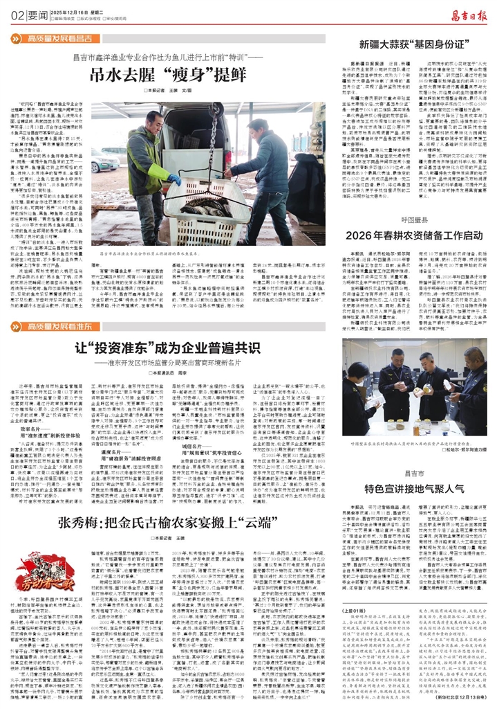 “收网咯!”昌吉市鑫洋渔业专业合作社理事长贾忠一声吆喝,养殖户闻声拉起渔网。标准化循环水池里,鱼儿被兜出水面,活蹦乱跳,溅起团团水花,现场一片欢声笑语。12月13日,该合作社将捕捞的吊水鱼供应给昌吉市某餐饮企业。