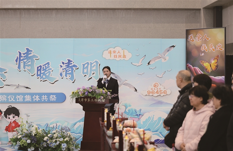 3月31日,天津市第三殡仪馆的工作人员在主持集体共祭仪式。