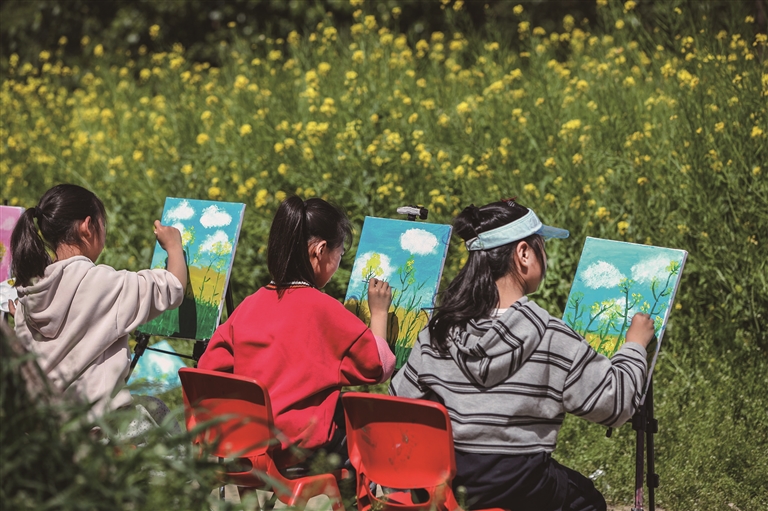 4月4日,在河南省焦作市博爱县人民公园,小朋友在写生。