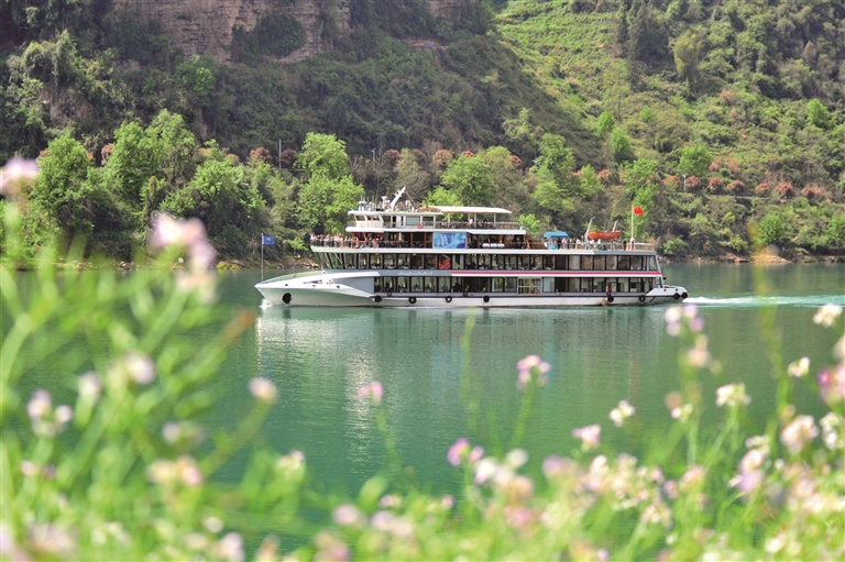 4月4日,在湖北省宜昌市夷陵区乐天溪镇境内的长江西陵峡水域,游客乘坐“长江三峡”7号游船游览峡江春景。□新华社发(张国荣摄)