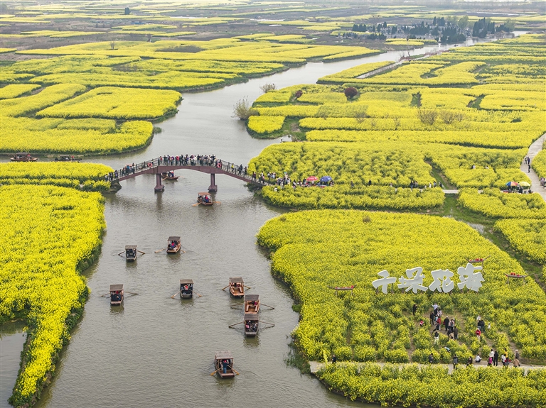 4月4日,游客在江苏兴化千垛景区踏青赏花(无人机照片)。