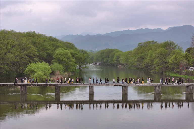 4月4日,游客在安徽省黄山市徽州区西溪南湿地踏青游玩(无人机照片)。