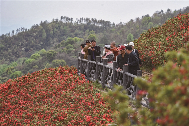 4月4日,游人在浙江省金华市金东区曹宅镇横腊村观赏盛开的杜鹃花。□新华社发(时宽兵摄)