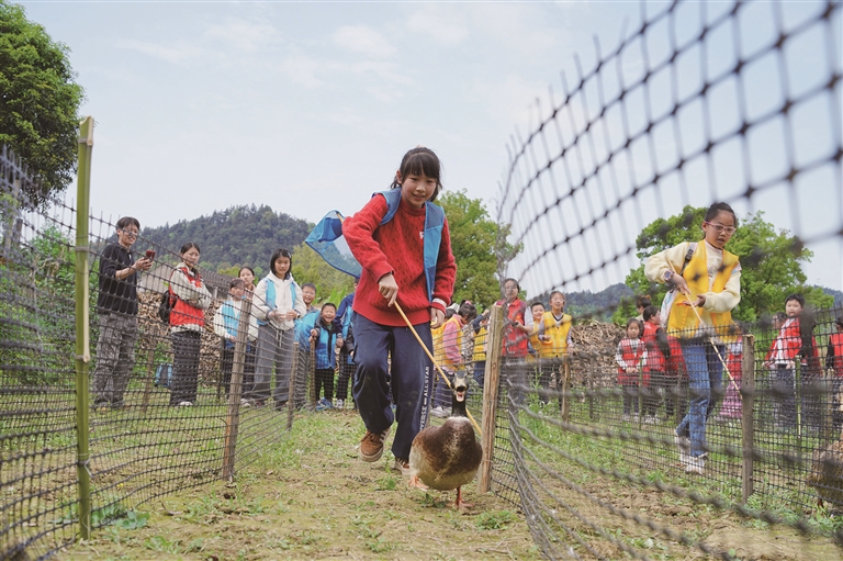 4月3日,在重庆市北碚区歇马街道虎头村一农场,孩子们参加赶鸭子比赛。