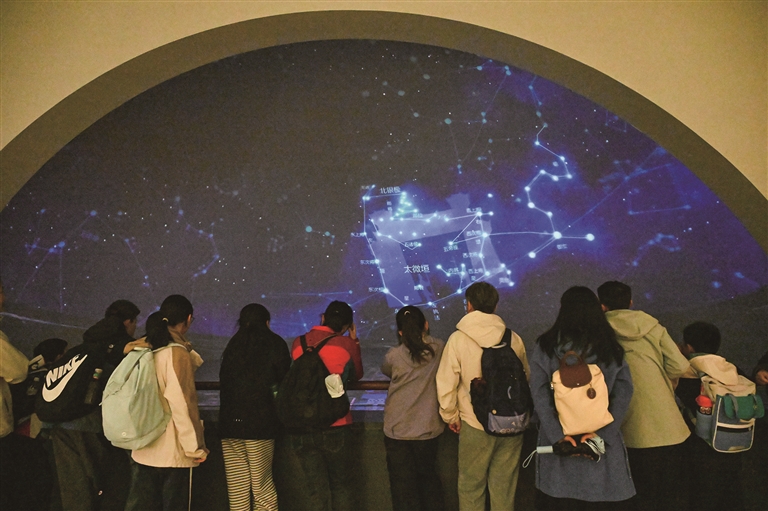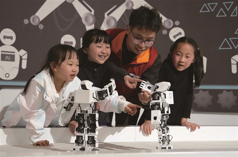 4月2日,志愿者带托管班孩子在江苏省海安市科技馆观看机器人表演。
