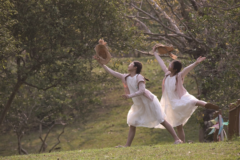 4月4日,两名学生在云南省勐腊县中国科学院西双版纳热带植物园内玩耍。