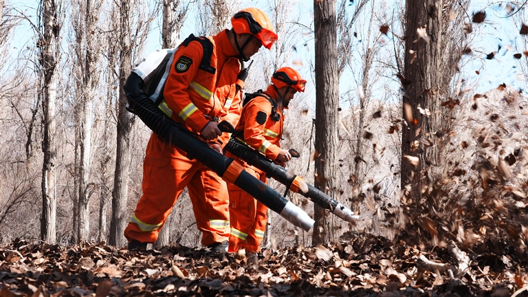 近日,阜康国有林管理局应急分队在阜康市重点林区使用风力灭火机集中清理林下枯枝落叶等易燃可燃物。