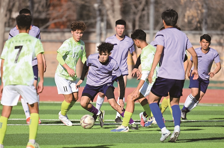 本报讯 记者许乐报道: 4月3日下午,昌吉州第四中学足球场上,裹挟着春日的微风,满是足球撞击草坪的闷响、球员的呐喊与场边观众的助威声。备战2026年“同心杯”·新疆足球超级联赛(简称“疆超”)的昌吉石河子足球联队,与昌吉州第四中学足球队的友谊赛在这里进行。